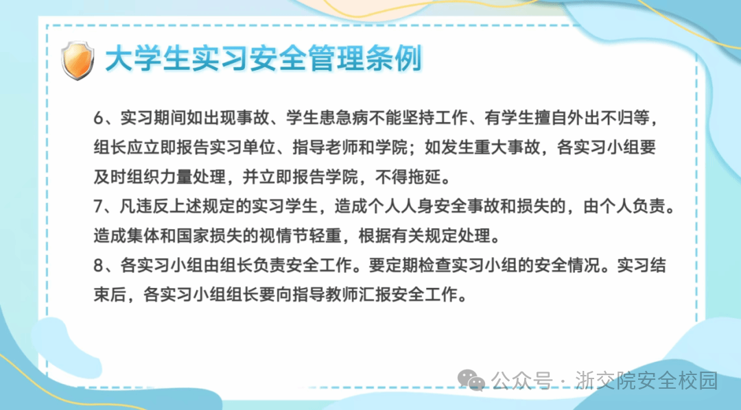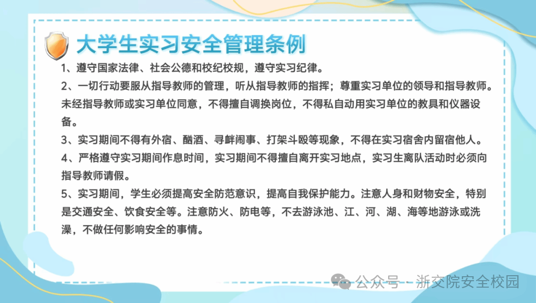 在出去实习时我们更应该注意安全,以下是关于实习安全的条例。