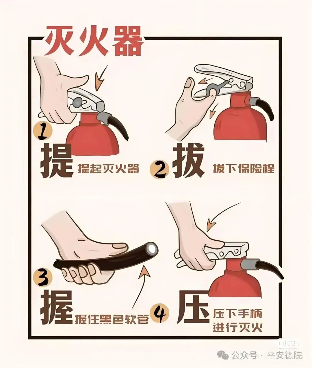 提示:灭火器操作前需确认类型,不确定时咨询学校保卫处或消防专业人员。